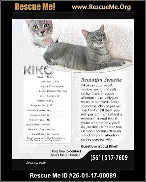 Read more »26-01-17-00089C01Kiko (f)(female)Domestic CatPalm Beach County, Palm Beach Gardens, FLID: 26-01-17-00089