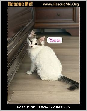 Yenta is a 4-5 month old medium-haired white and tabby kitten who has never missed a thing in her life and does not