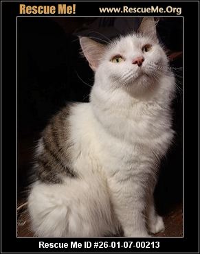 White with grey tabby patches. Really thick hair, medium length. Weight 15lbs. Loves to give kisses.